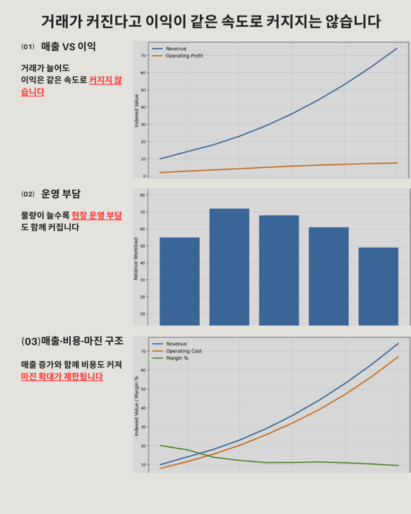 겉으로는 성장처럼 보여도 실제로는 운영 부담이 함께 커지면서 이익 개선 폭이 제한될 수 있습니다.